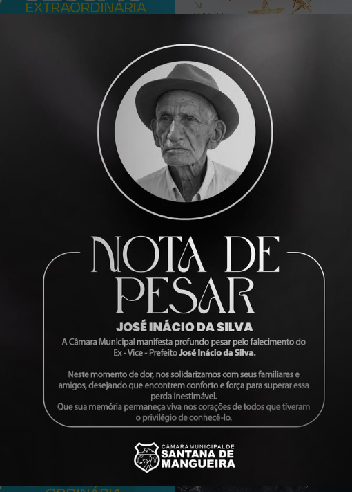 A Câmara Municipal de Santana de Mangueira lamenta profundamente a partida de José Inácio da Silva. Que sua memória permaneça viva e que Deus conceda força e consolo aos familiares e amigos neste momento de dor.