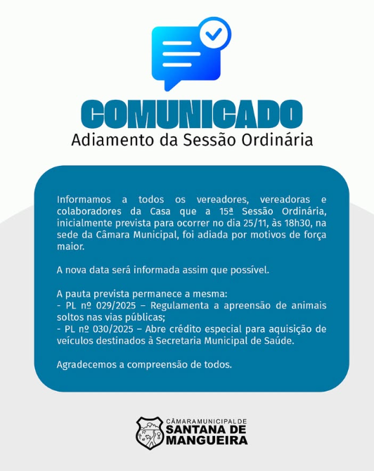 A Câmara Municipal de Santana de Mangueira convida toda a população para acompanhar a nossa próxima Sessão Ordinária. 📅 Data: Terça-feira, 02 de Dezembro ⏰ Horário: 18h30min 📡 Transmissão: Acompanhe ao vivo pelo nosso canal no YouTube: TV Câmara Santana de Mangueira. Pauta do Dia: PL nº 029/2025 – Regulamenta a apreensão de animais soltos […]