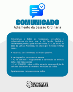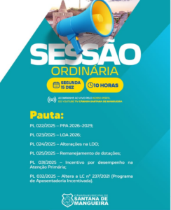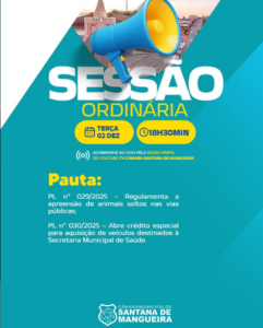 A Câmara Municipal de Santana de Mangueira convida toda a população para acompanhar a nossa próxima Sessão Ordinária. 📅 Data: Terça-feira, 02 de Dezembro ⏰